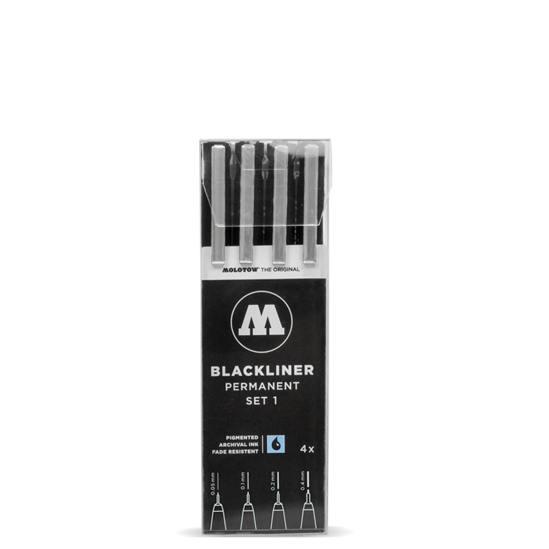 Różnorodne zestawy markerów Molotow Blackliner w plastikowych opakowaniach.