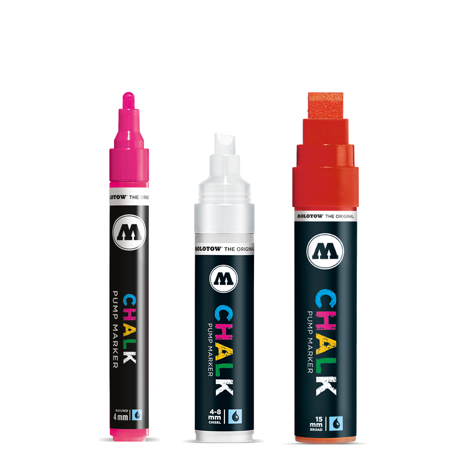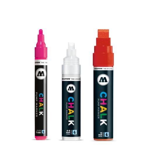 Markery kredowe Molotow są idealne do tymczasowych zastosowań na wszystkich gładkich i niechłonnych powierzchniach oraz artystycznych wariacji na płótnach. Szybkoschnący atrament można łatwo usunąć.Charakteryzują się głęboką czernią i brakiem efektu szarzenia. Ponadto dwa kolory (czarny i czerwony) nadają się do użytku na zewnątrz i są odporne na deszcz. Wysoko nieprzeźroczyste, doskonale nadają się do witryn sklepowych, luster, szkła, płytek, metalu, plastiku, płyt itp. Pierwsza farba kredowa na świecie z dwoma metalizowanymi kolorami!