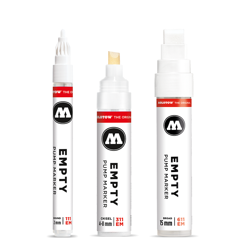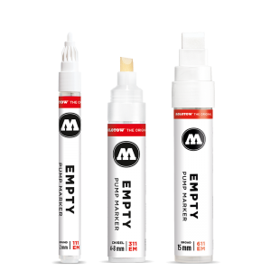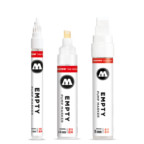 Pełna gama pustych markerów Molotow, o różnych pojemnościach, z różnorodnymi szerokościami wymiennych filców.
